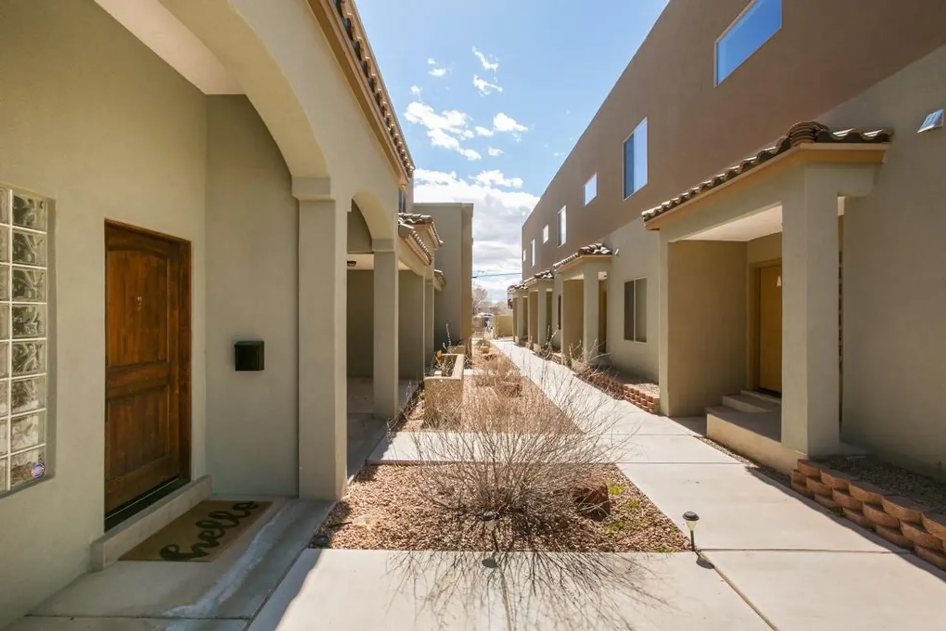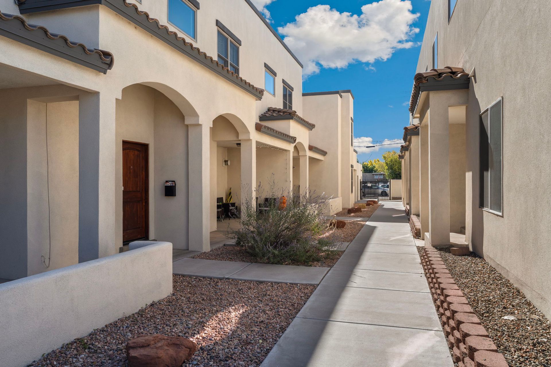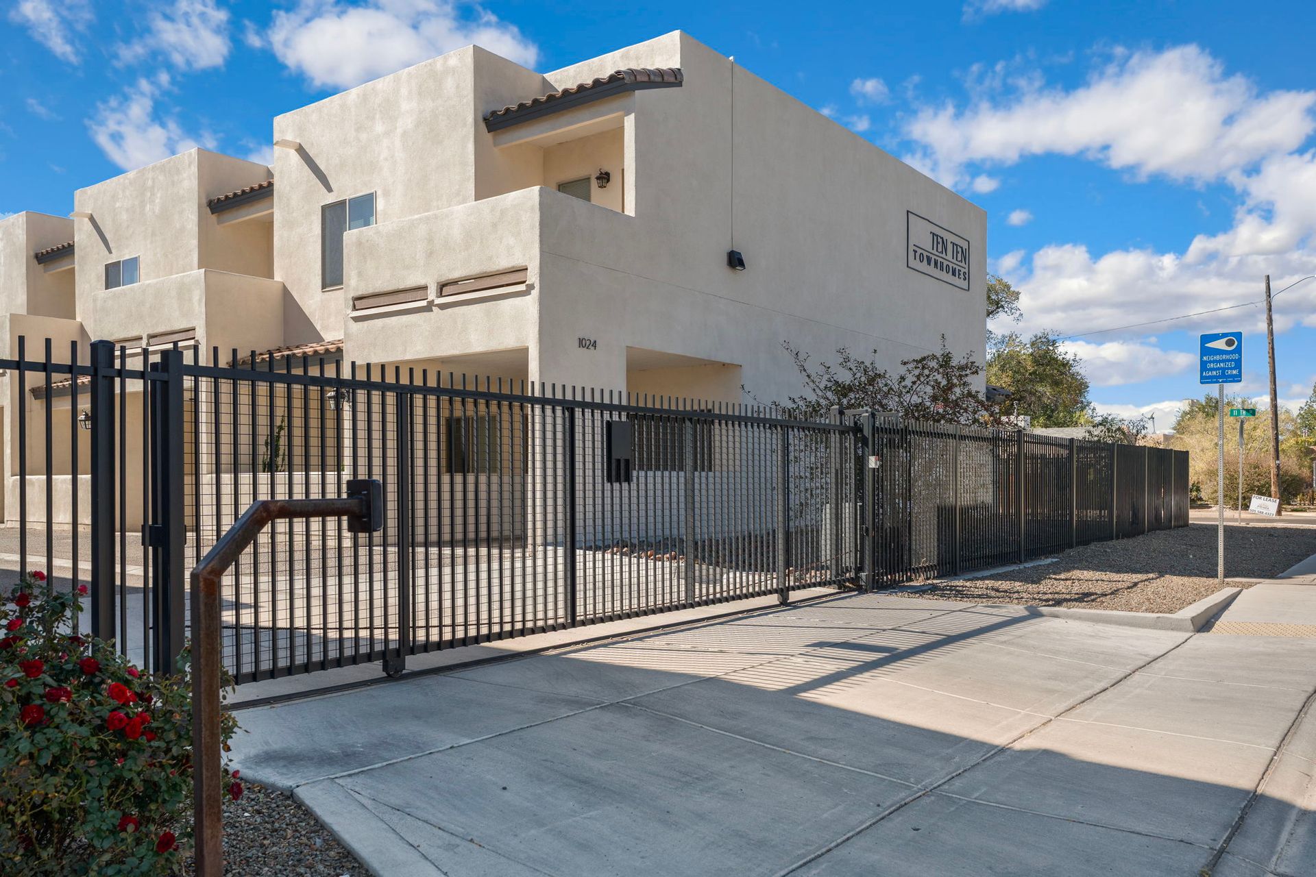 Gorgeous 2 Bedroom, 2 1/2 bathroom, two story townhome with garage in downtown Albuquerque. Both bedrooms have an ensuite bathroom. 1/2 bath is located downstairs. You'll be delighted with your granite counter tops, custom wood cabinets, Kiva fireplace, modern stainless steel range hood and stainless-steel appliance package in the kitchen. Flooring on first floor includes all tile. Keep cozy with your own gas Kiva fireplace. Stairs, upstairs hallway and both bedrooms have rich redwood floors. You'll love the wood blinds on all windows, and full size washer and dryer. A private garage comes with this townhome. Large sliding doors lead to the front patio. The backdoor leads to smaller patio area. The property is fully gated and close to EVERYTHING! It's right next door to the historic Huning Castle neighborhood. Downtown convenience is where you'll find your new home at Ten Ten Townhomes. If convenience is what you want, you'll love all the charming shops and restaurants in Old Town. If you need public transportation, Albuquerque Rapid Transit is only a couple of blocks away.