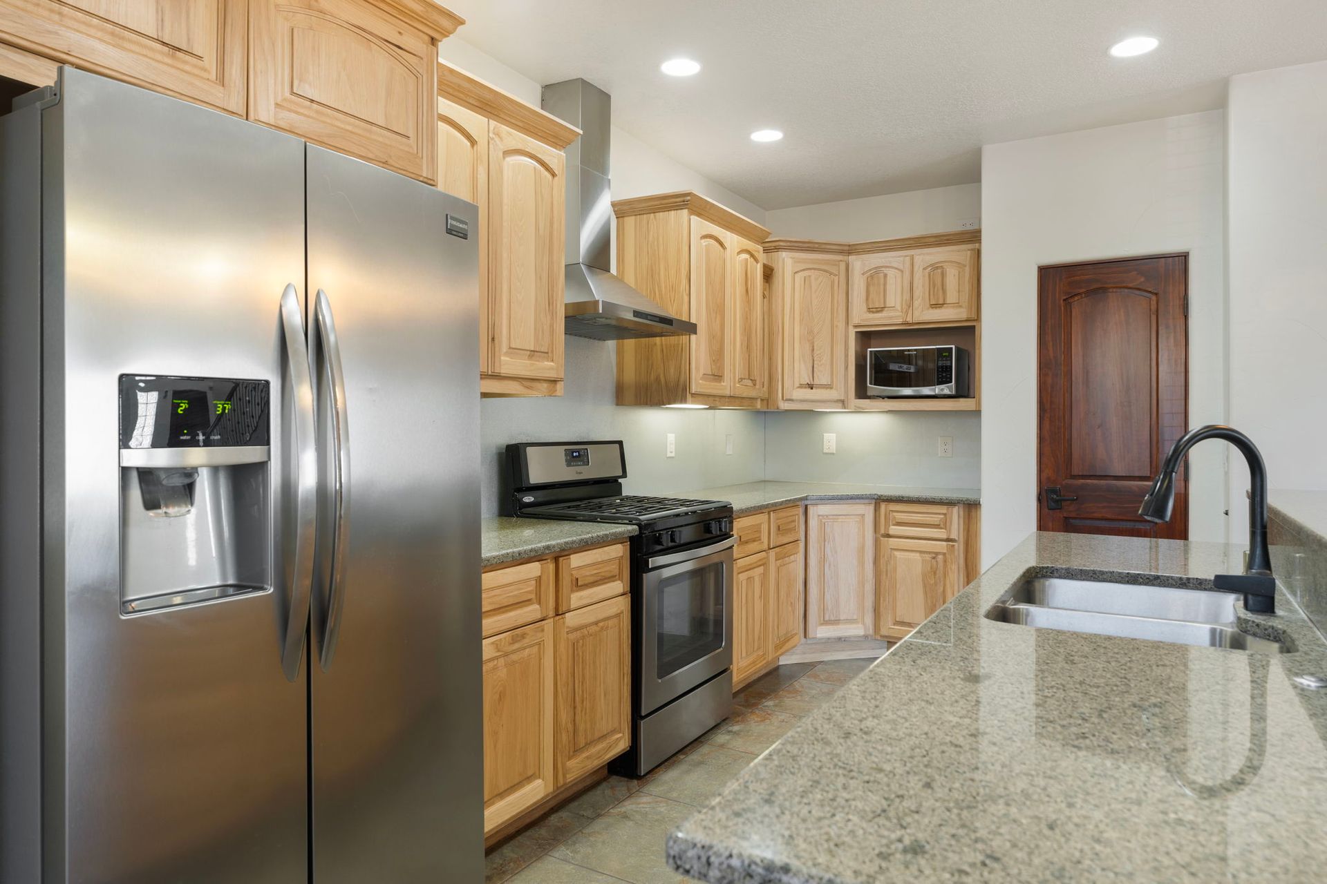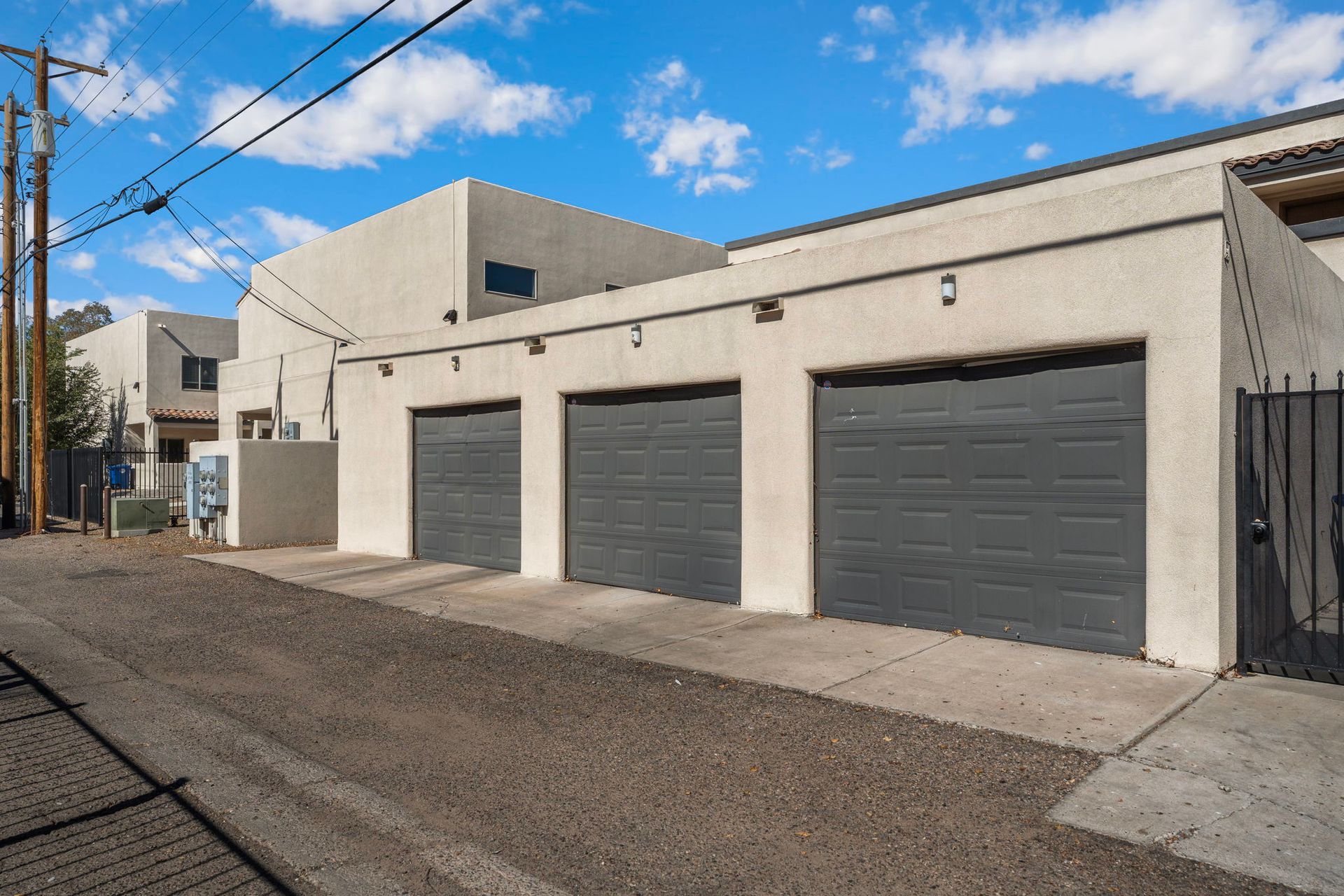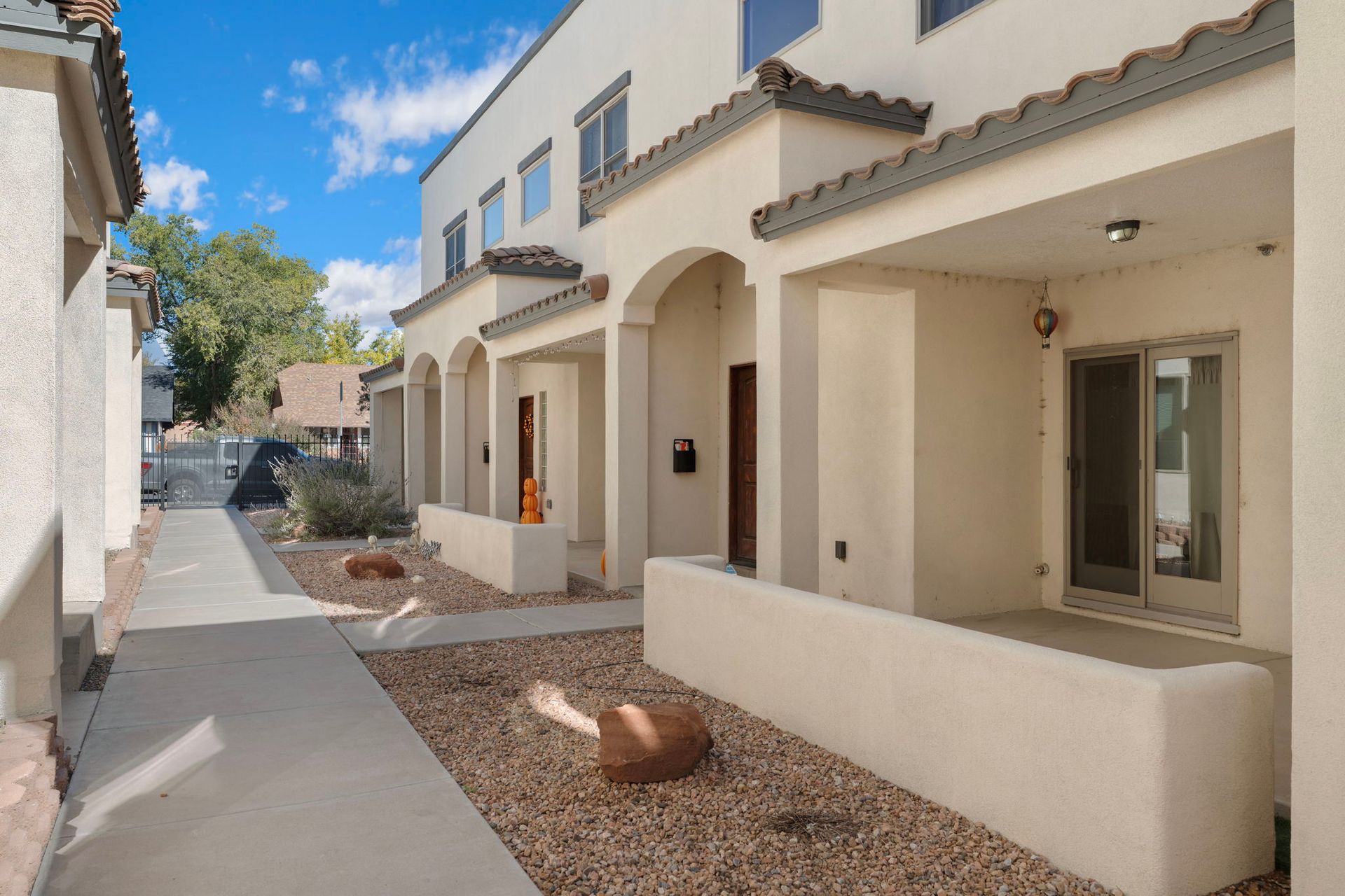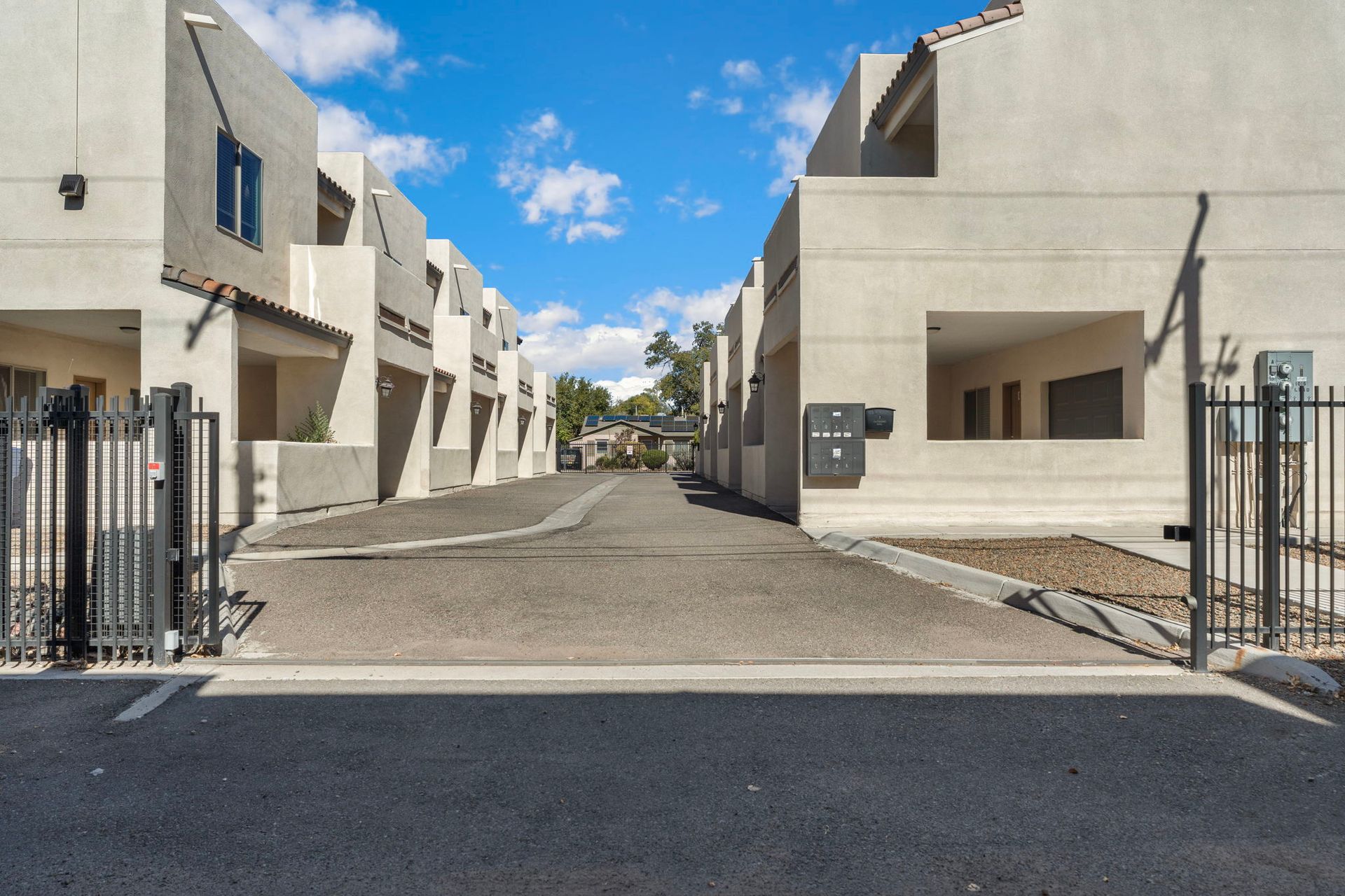 Gorgeous 2 Bedroom, 2 1/2 bathroom, two story townhome with garage in downtown Albuquerque. Both bedrooms have an ensuite bathroom. 1/2 bath is located downstairs. You'll be delighted with your granite counter tops, custom wood cabinets, Kiva fireplace, modern stainless steel range hood and stainless-steel appliance package in the kitchen. Flooring on first floor includes all tile. Keep cozy with your own gas Kiva fireplace. Stairs, upstairs hallway and both bedrooms have rich redwood floors. You'll love the wood blinds on all windows, and full size washer and dryer. A private garage comes with this townhome. Large sliding doors lead to the front patio. The backdoor leads to smaller patio area. The property is fully gated and close to EVERYTHING! It's right next door to the historic Huning Castle neighborhood. Downtown convenience is where you'll find your new home at Ten Ten Townhomes. If convenience is what you want, you'll love all the charming shops and restaurants in Old Town. If you need public transportation, Albuquerque Rapid Transit is only a couple of blocks away.